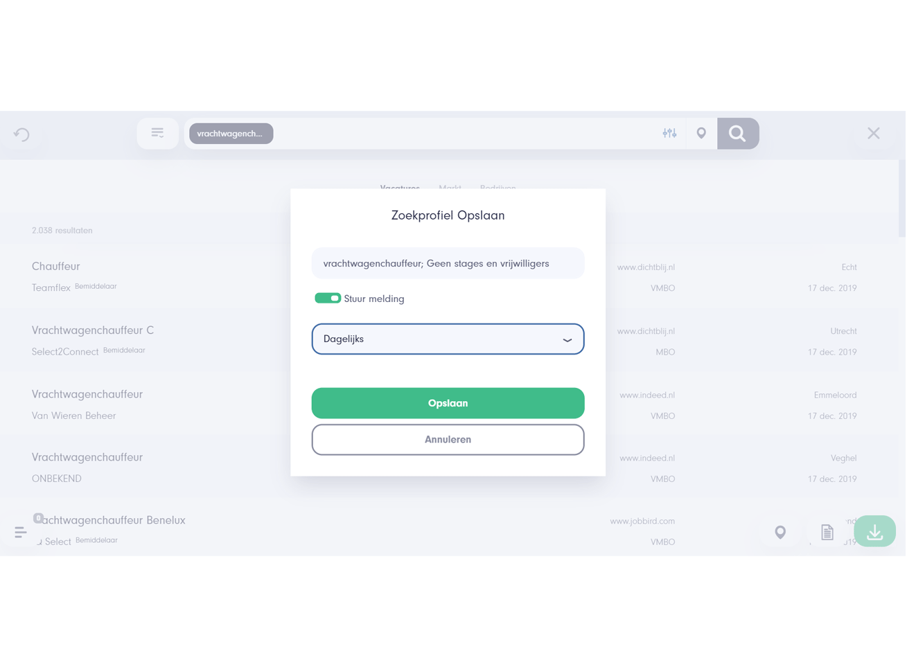 Stel een zoekprofiel op basis van een functie, sector en standplaats in en activeer of deactiveer bepaalde filters. Filter bijvoorbeeld de vacatures van bemiddelaars eruit of bekijk de vacatures die langer dan 2 weken openstaan.