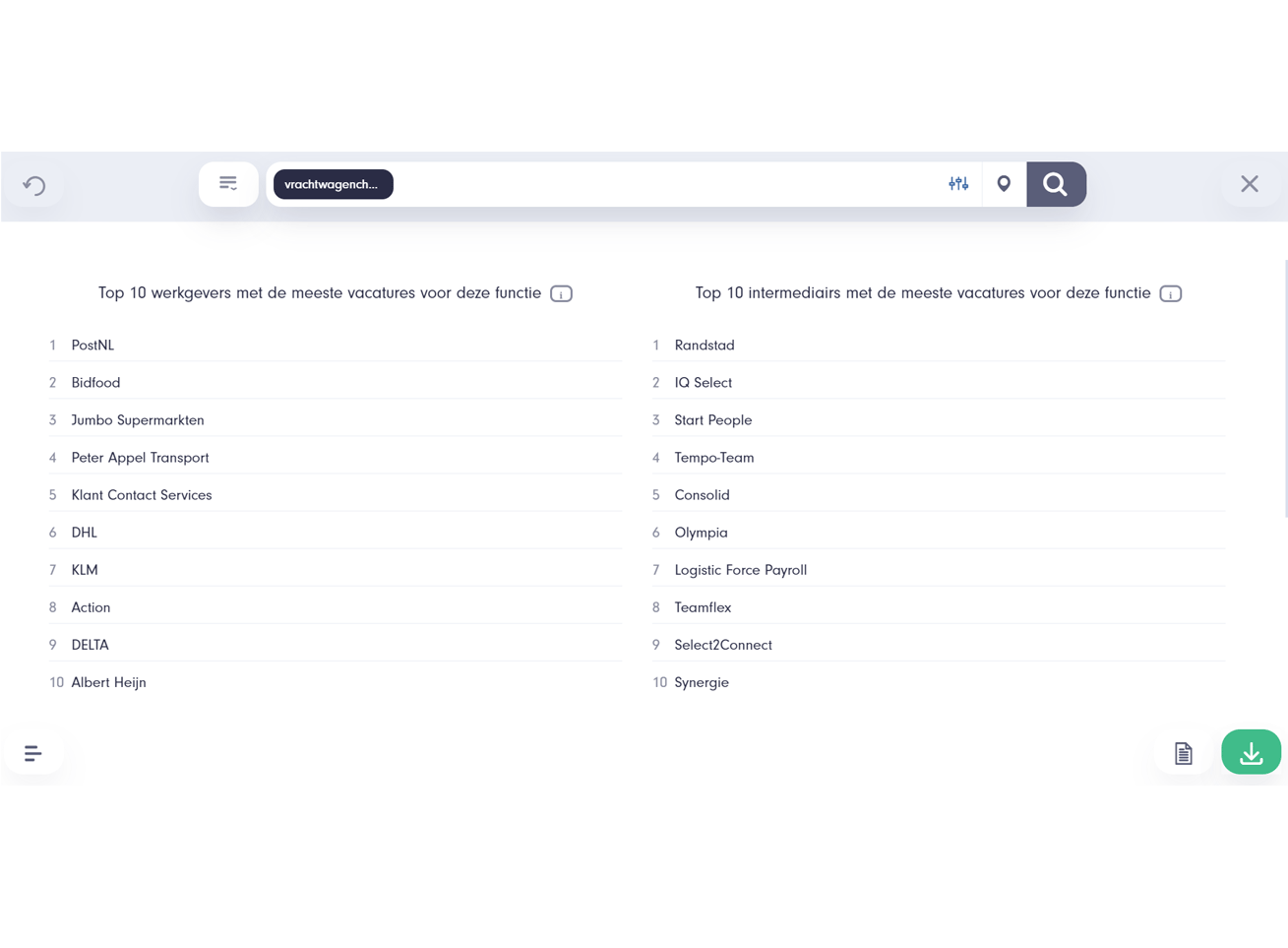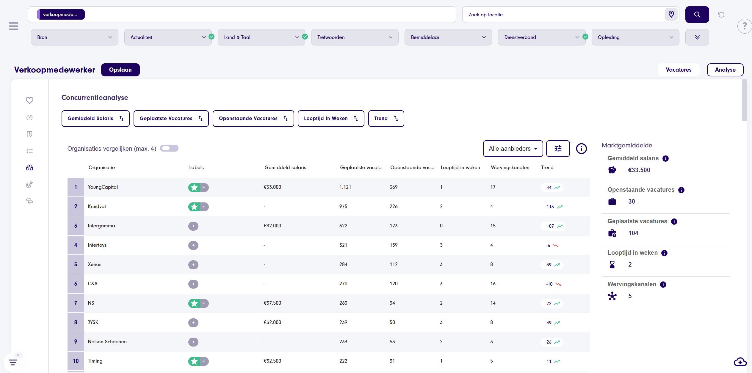 Vergelijk eenvoudig verschillende directe werkgevers en/of bemiddelaars en ontdek de grootste spelers op de arbeidsmarkt. Het is belangrijk om te weten wat jouw positie op de arbeidsmarkt is, zodat je effectief kunt benchmarken ten opzichte van concurrenten, sneller trends ontdekt in jouw marktsegment en beter inspeelt op sales- en recruitmentkansen of strategische beslissingen kunt nemen.