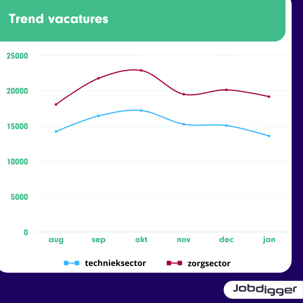 Allereerst nemen we je mee in het aantal openstaande vacatures in de techniek-en zorgsector. Hiervoor kijken we naar de periode van augustus 2025 tot en met januari 2026. Wat we zien, is dat er in beide branches veel openstaande vacatures zijn. De zorgsector telt echter meer openstaande vacatures dan de technieksector.