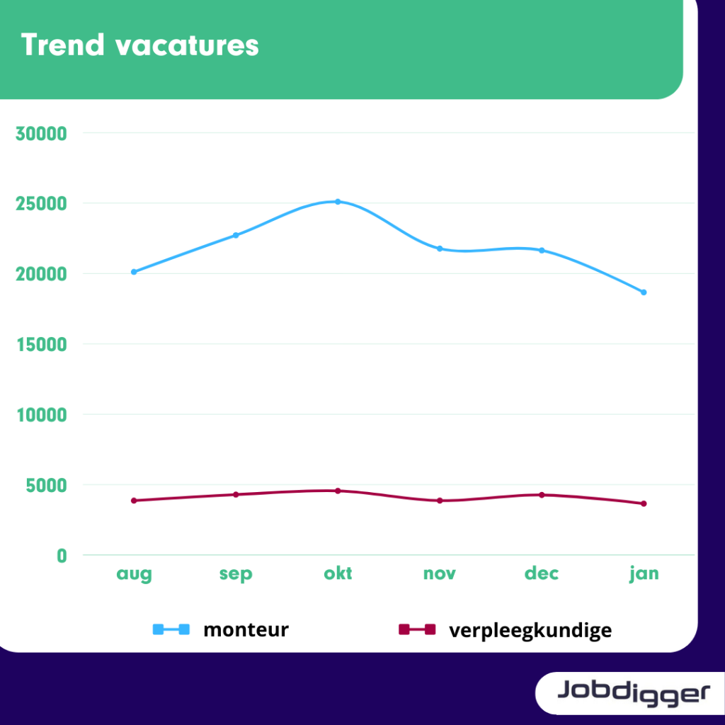 Bij het UWV zien ze dat er veel vraag is naar monteurs en verpleegkundigen. Dat zien wij ook terug in onze data. Daarom kijken we nu specifiek naar deze functietitels.