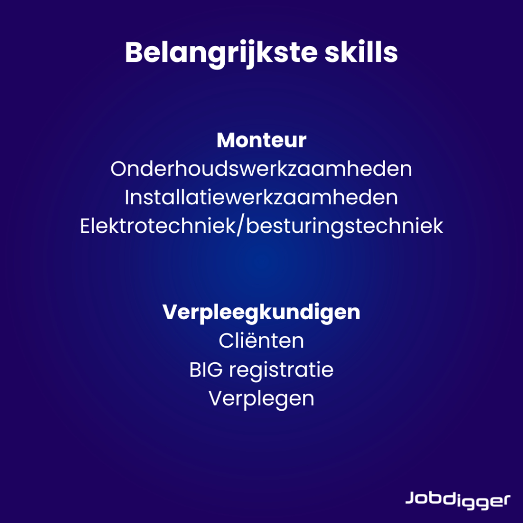 We zien in onze data dat er veel vraag is naar monteurs en verpleegkundigen. Om het wervingsproces te versnellen, kun je als werkgever of bemiddelaar gebruikmaken van skills. Door skills toe te voegen aan je vacaturetekst, wordt je vacature duidelijker. De potentiële nieuwe medewerker weet dan beter wat er van hem of haar wordt verwacht. Dit vergroot de kans op een snellere en betere match. Ontdek de belangrijkste skills voor monteurs en verpleegkundigen.