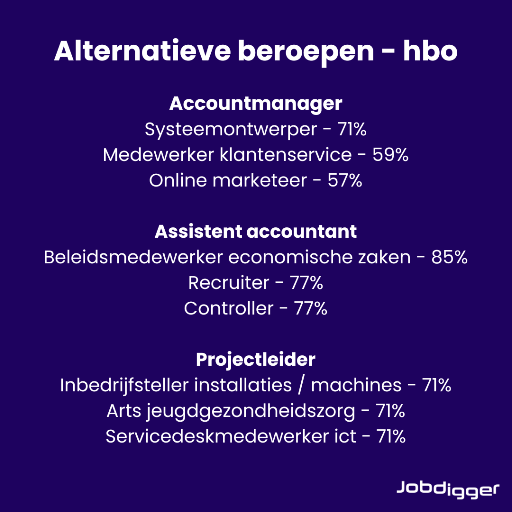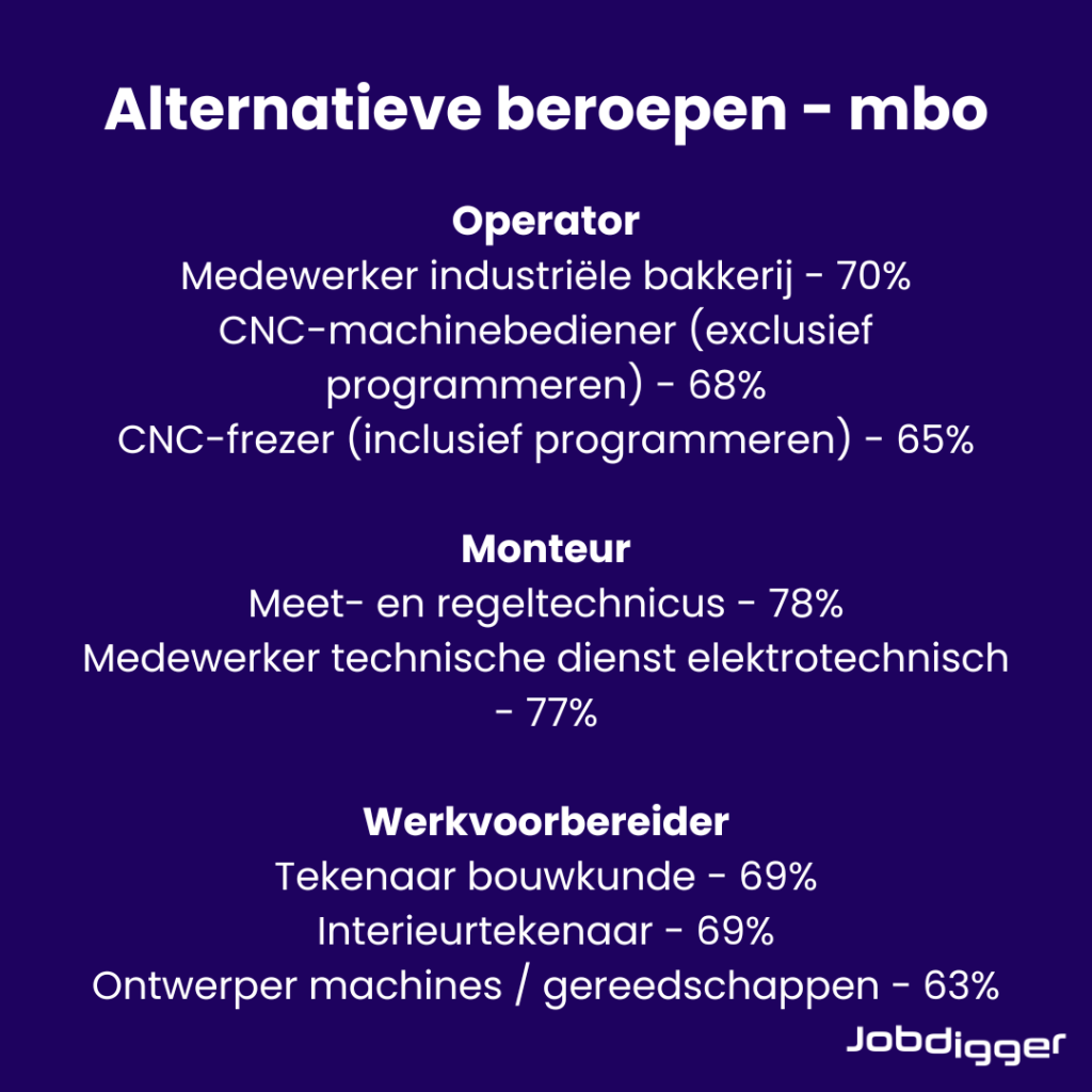 We nemen je mee in het aantal voorbeelden. Hiervoor kijken we naar de top 3 functietitels van het mbo en het hbo. Dit zijn voornamelijk populaire functietitels, waardoor de kans groot is dat deze vacatures snel worden ingevuld, maar we laten aan de hand van deze functies zien wat de mogelijkheden zijn en hoe groot de match is met het alternatieve beroep. We laten hierbij nieuwe beroepen zien, waarbij het oorspronkelijke beroep niet in de functienaam terugkomt, we laten dus bijvoorbeeld niet ‘Hoofdmonteur elektriciteitsnetten’ zien.