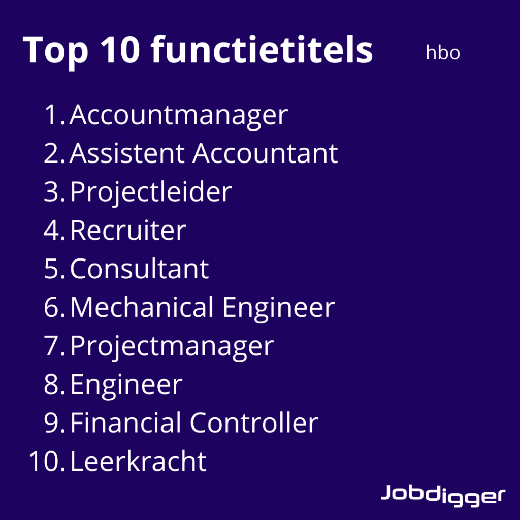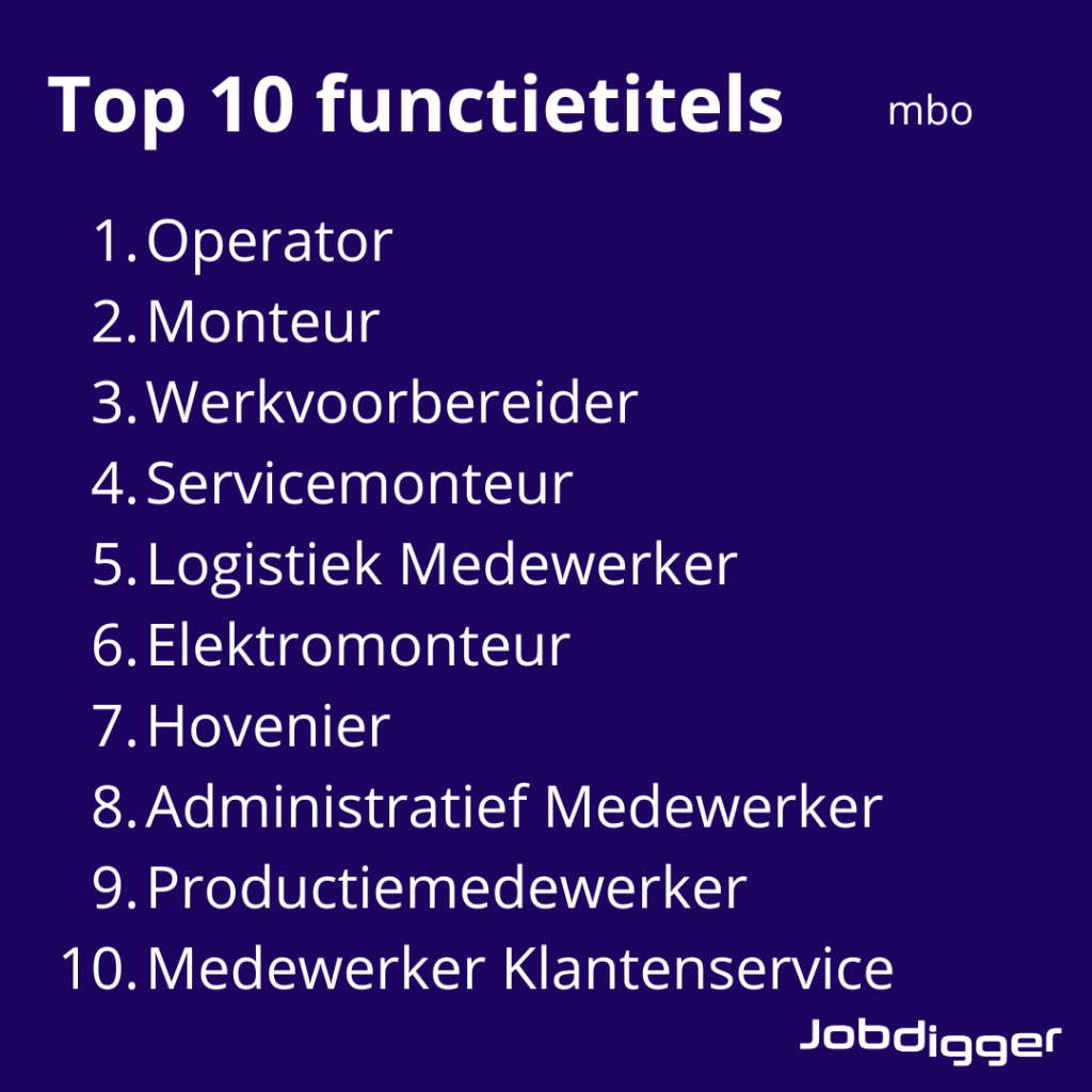 Bij het mbo zien we vooral veel praktische functies, met name in de techniek. De top 10 komt grotendeels overeen met de algemene top 10. Bij het hbo zien we vooral veel kennis-, advies- en managementgerichte functies terug.