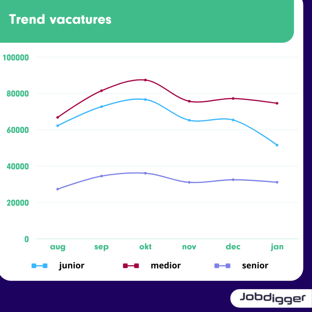 Hoeveel juniorfuncties werden de afgelopen tijd aangeboden? We kijken hiervoor naar de periode van augustus 2025 tot en met januari 2026. Om een goed beeld te krijgen van de toenemende werkloosheid, vergelijken we het aantal aangeboden juniorfuncties met medior- en seniorfuncties.